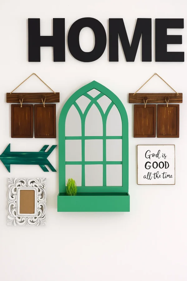 ✅ Size: 8″ alphabet HOME,  12″ wide arrow, 10″ each hand carved frame , 2 brown photo holders 12″ wide , 8*8″ Signboard and 1.5 feet window with mirror